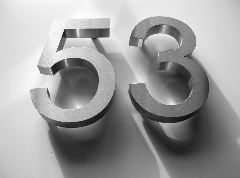 Built up stainless steel house numbers. Arial font, 200mm high with 20mm returns. brass locator fixings, paper template.